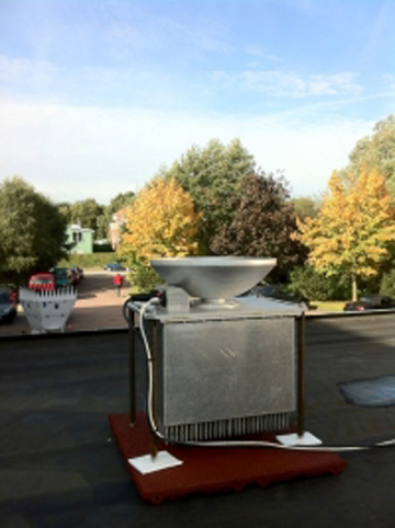 The radar components of the MIRA-35c are installed in a weatherproof outdoor enclosure with dimensions of 45cm/55cm/50cm. This enclosure hosts the transmitter, the receiver and the MicroBlaze-based signal processor board, and also supports the radar antenna. An extra radar-PC (standard indoor type) needed for saving raw radar data via Ethernet line, second-stage data processing, data visualisation and remote control via internet access are installed separately in a temperature-controlled shelter or inside an optionally offered trailer.