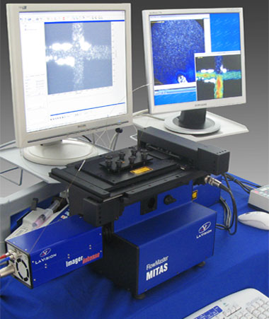 For standard applications a 500mW DPSS laser for pulsed illumination, a high sensitive, dual frame-multiple exposure CCD camera is used. A system PC with built-in synchronisation unit controls the complete laser imaging system. LaVision’s modular DaVis software is used for advanced image acquisition and data analysis. The xyz (focus)-traverse system can be operated manually using a joy stick or the device control manager in DaVis. The light is delivered through an optical fibre to the microscope. A built-in pilot LED is used for target focusing. The filter cube exchange box allows a fast adaptation for different excitation and emission wavelengths. CCD camera, light source and synchronization are also under DaVis control.